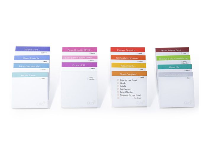 Please Complete, Prior to the Next Visit, Protocol Deviation, Please Clarify, Please Add to Drug Accountability Log, Serious Adverse Event, Adverse Event, Temperature Excursion, Per the Source, Please File, Please Report to IRB/EC, Adverse Event of Special Interest, Please Reconcile, Per the eCRF, Concomitant Medication, and a Blank CRA Audit Note.