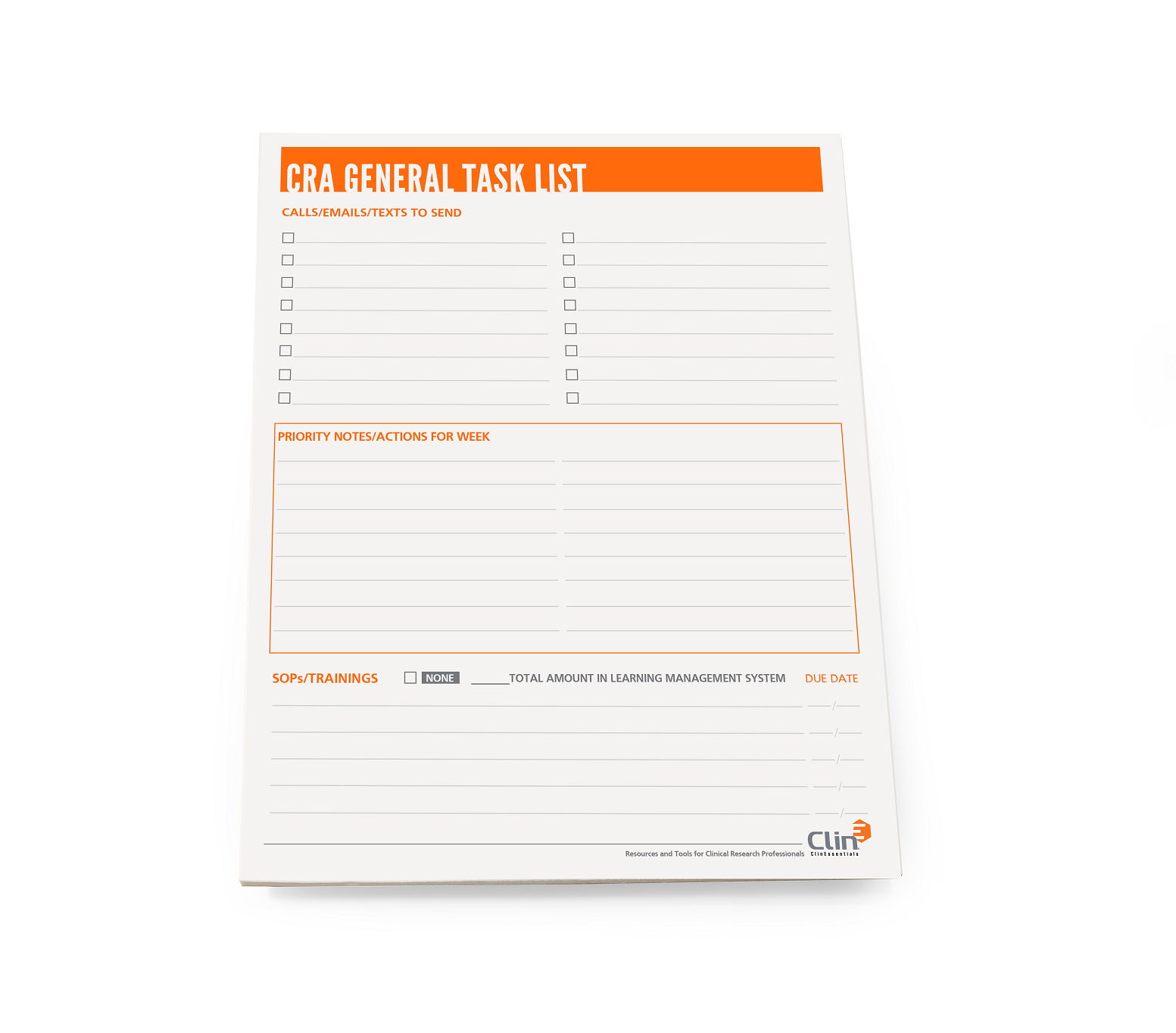 Staying on top of your studies has never been easier with the ClinEssentials™ CRA General Task List! Use the task list to keep track of actions and/or priorities and write general notes on the back as needed.